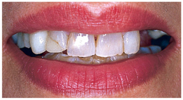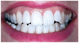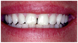 Joanne took the antibiotic Tetracycline prior to the eruption of her adult teeth. This caused the mauve/grey shading seen here. She also disliked her left upper incisor, which was rotated.